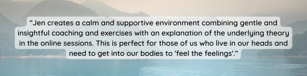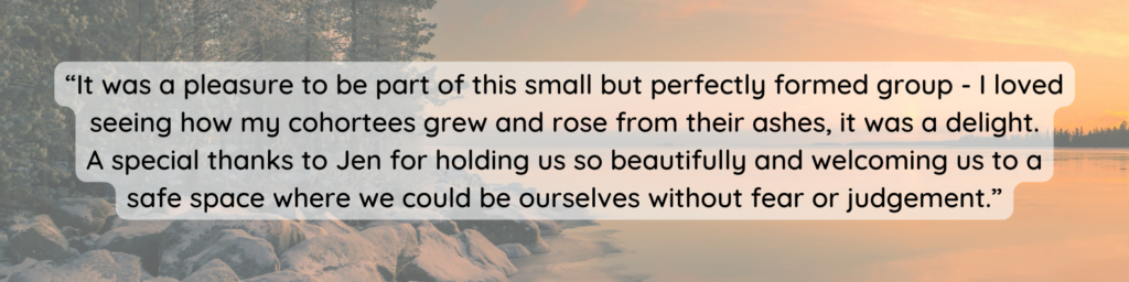 Throughout, we will have regular group calls to explore new ideas, receive coaching and support each other. Alongside we will have regular daily check ins and support both from Jen and your peers to help you maintain momentum and find accountability. The group will be no more than 5 women to ensure that you all get space every week to talk about what is coming up for you and be held by the group.